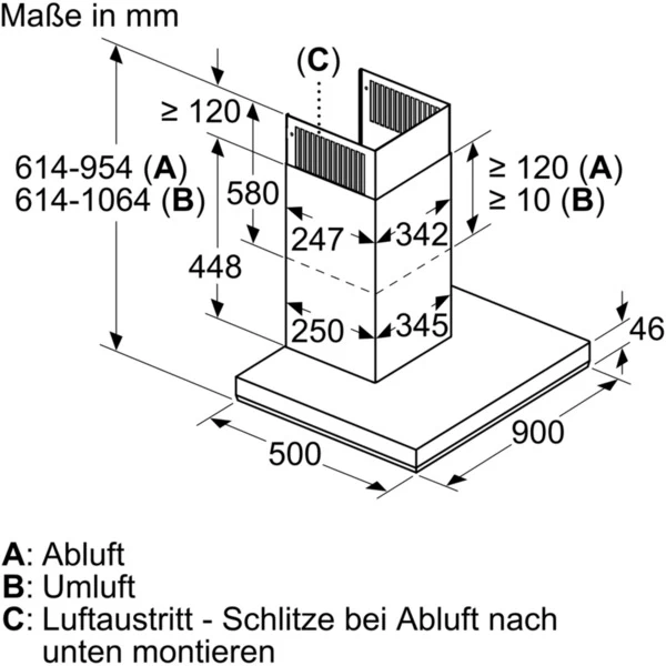 | Weitere Informationen | Gerätemaße Abluft (HxBxT): 628-954 x 898 x 500 mm | Gerätemaße Umluft (HxBxT): 628-1064 x 898 x 500 mm | Gerätemaße Umluft mit Clean Air Modul Montage auf Außenkanal (HxBxT): 689 x 898 x 500 mm | Gerätemaße Umluft mit Clean Air Modul Montage auf Innenkanal (HxBxT): 809-1139 x 898 x 500 mm | ||