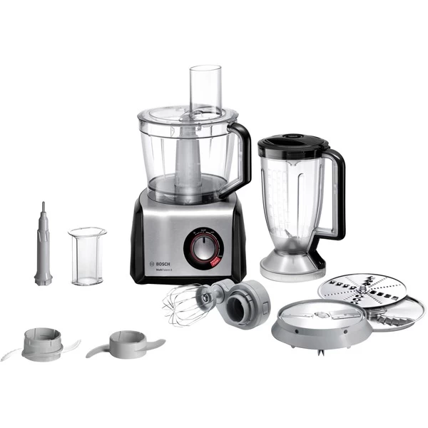 Die Küchenmaschine MultiTalent 8 MC812M814 von Bosch ist vielseitig einsetzbar und trotzdem kompakt. Durch das Feature Smart tool detection werden die Zubehöre automatisch erkannt und der Motor auf die maximale Drehgeschwindigkeit begrenzt. Damit kann man nichts mehr falsch machen. Zudem sorgt die Farbcodierung für einfache und intuitive Montage des Zubehörs. Dank des leistungsstarken 1.250-Watt Motors, der stufenlosen Einstellung der Geschwindigkeit mit Momentstufe sowie der LED-Bedienerführung zaubert man im Nu leckere Gerichte auf den Tisch. Ob Rühren, Kneten, Zerkleinern, Schlagen, Pürieren, Reiben, Raspeln, Mixen oder Schneiden, mit dem vielseitigen Zubehör lassen sich Gerichte schneller und perfekt zubereiten. Auch heiße Suppen, eiskalte Shakes oder Smoothies lassen sich mit dem Mixaufsatz kinderleicht herstellen. Die Reinigung ist ebenso komfortabel, da das Zubehör bequem im Geschirrspüler gereinigt werden kann.