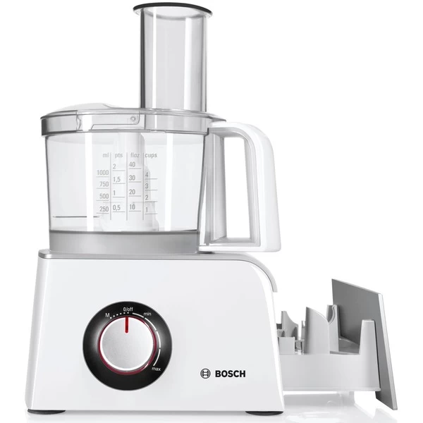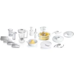 | Zubehör | vorhanden | Rührschüssel inkl. transparentem Deckel mit Einfüllhilfe und Stopfer, Multifunktionsmesser und Schlagscheibe, Mixer-Aufsatz, Schneideinsätze (dick und dünn), Raspeleinsätze (grob und fein), Teigwerkzeug, Pommes-Frites-Scheibe, Zitruspresse, Saftzentrifuge | |