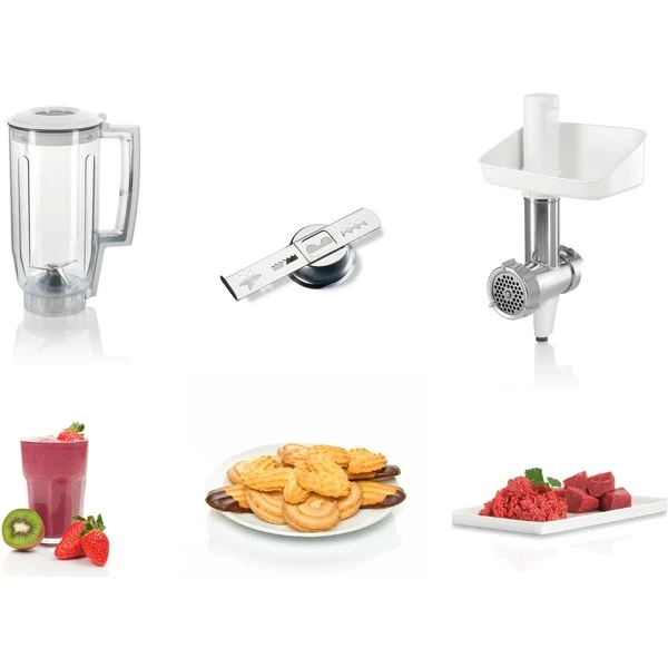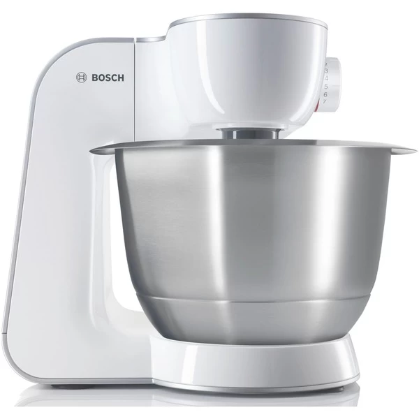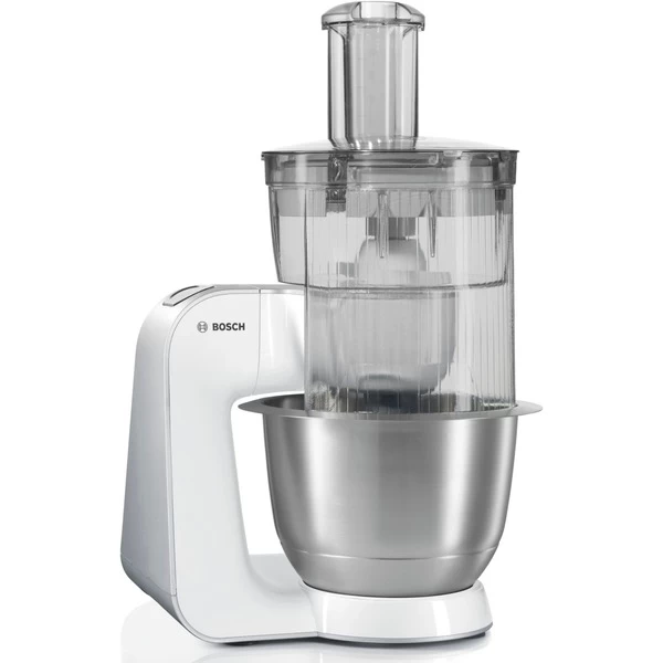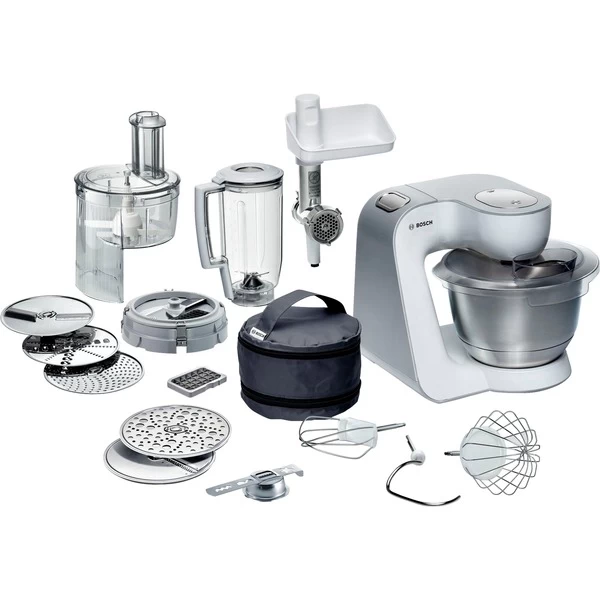 Die Küchenmaschine Bosch MUM 54270 ist ein Universaltalent mit sieben Schaltstufen und einer zusätzlichen Momentstufe zum Zerkleinern und Hacken. Durch das vielfältige Zubehör, welches sich in der mitgelieferten Zubehörtasche verstauen lässt, macht Kochen und Backen wieder richtig Spaß. Dank des 3D-Rührsystems „Multi-motion-drive“ nimmt das Gerät einem alle Vorarbeiten ab, vom einfachen Mixen über Teigrühren, bis hin zum Zerkleinern. Die MUM 54270 besitzt eine Edelstahl-Rührschüssel für maximal 2 kg Teig sowie einen Mixer-Aufsatz mit einem Fassungsvermögen von 1,25 Liter. Somit besteht beim nächsten Rührkuchen die Herausforderung nur noch darin, das beste Rezept zu finden. In punkto Sicherheit glänzt die MUM 54270 mit einem Überlastungsschutz und rutschfesten Gummifüßen für einen sicheren Stand auf der Arbeitsfläche.