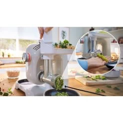 | Zubehör | vorhanden | Deckel, Edelstahl-Rührschüssel, Fleischwolf, Knethaken, Kunststoff-Rührschüssel, Mixeraufsatz Kunststoff, Raspelwendescheibe grob/fein, Reibscheibe grob, Reibscheibe fein, Schneidwendescheibe dick/dünn, Spritzgebäckvorsatz, Würfelschneider, Würfeleinsatz 13 mm, Lochscheibe 5 mm, Premium Schlagbesen, Premium Rührbesen, dunkelgraue Zubehörtasche | |