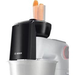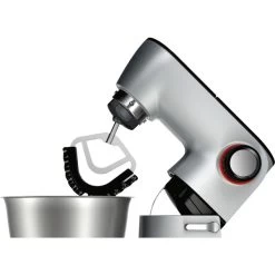 | Zubehör | vorhanden | 1 x Raspelwendescheibe, 1 x Reibscheibe mittelfein, 1 x Schlagbesen, 1 x Schneidwendescheibe, 1 x Deckel, 1 x Durchlaufschnitzler, 1 x Edelstahl-Rührschüssel, 1 x Knethaken Metall, 1 x Profi Flexi- Rührbesen | |