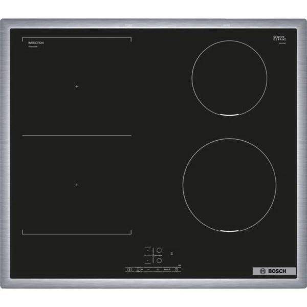 Das Induktions-Kochfeld Bosch PVS645BB6E stellt vier Induktions-Kochzonen mit Topferkennung und 17 Leistungsstufen zum Kochen, Braten und Garen zur Verfügung. Dank CombiZone lassen sich zwei Kochzonen flexibel zu einer großen Zone zusammenschalten, für das Kochen z.B. in einem Bräter. TouchSelect ermöglicht eine direkte, einfache Auswahl der gewünschten Kochzone, Leistungsstufe und zusätzlicher Funktionen, wie QuickStart- und ReStart. PowerBoost sorgt für kürzere Ankochzeiten mit bis zu 50% mehr Leistung. Für jede Kochzone kann ein Timer mit Abschaltfunktion programmiert werden, der die gewählte Kochzone nach der festgelegten Zeit automatisch abschaltet. In puncto Sicherheit überzeugt das PVS645BB6E mit einer 2-stufigen Restwärmeanzeige je Kochzone, Kindersicherung und automatischer Sicherheitsabschaltung.