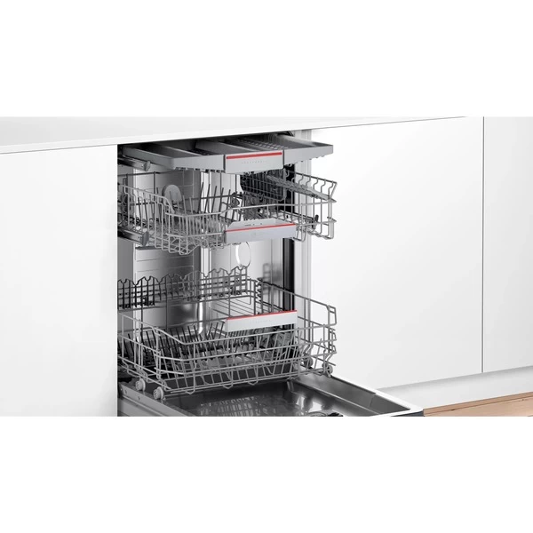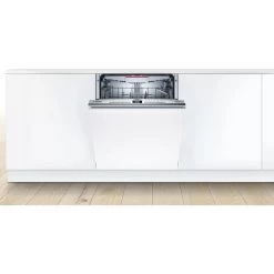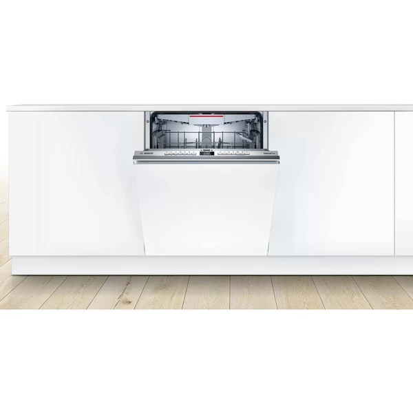 Der vollintegrierbare XXL-Geschirrspüler Bosch SBH4HCX48E nimmt bis zu 14 Maßgedecke auf und eignet sich dank dem VarioScharnier auch für Küchen mit niedriger Sockelhöhe und den Hocheinbau. Zur Verfügung stehen sechs verschiedene Spülprogramme sowie vier Zusatzfunktionen. Die Automatikprogramme sorgen automatisch für beste Spülergebnisse und mit dem Favoritenprogramm können individualisierte Einstellungen mit nur einem Knopfdruck gestartet werden. Die Flex Körbe und die VarioSchublade lassen sich praktisch und komfortabel Beladen. Die Glasschutz-Technik sorgt für die schonende Behandlung von Gläsern und empfindlichem Geschirr und die zuwählbare Extra Trocknen-Funktion ermöglicht extra gründliches Trocknen bei schwer zu trocknender Beladung. StatusLight – ein Lichtsignal in der linken oberen Ecke zeigt an, ob der Geschirrspüler läuft. Das AquaStop-System schützt vor Wasserschäden. Mit einer Lautstärke von 44 Dezibel ist der SBH4HCX48E zudem angenehm leise, noch leiser läuft er im Silence-Programm. Dank der Home Connect-App ist der Geschirrspüler SBH4HCX48E über Handy oder Tablet steuerbar.