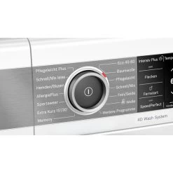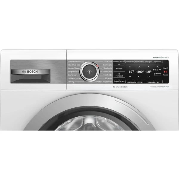 | Display/Anzeige | hochauflösendes TFT-Klartextdisplay für intuitive Bedienung mit Anzeige zum Programmablauf, Temperaturwahl, max. Schleuderdrehzahl, Restzeitanzeige, 24 h Endezeitvorwahl, zusätzliche Optionen und Verbrauchsanzeige (Angabe zu Strom- und Wasserverbrauch), Beladungsanzeige mit direkter Dosierempfehlung, Anzeige für Überdosierung, Programmablauf, Restzeit | ||