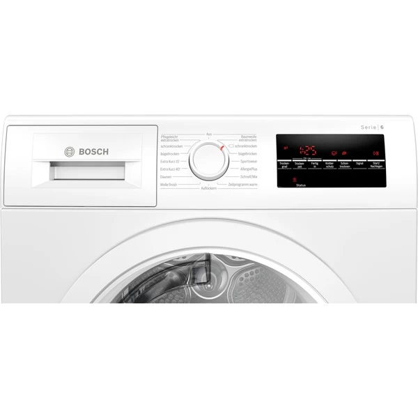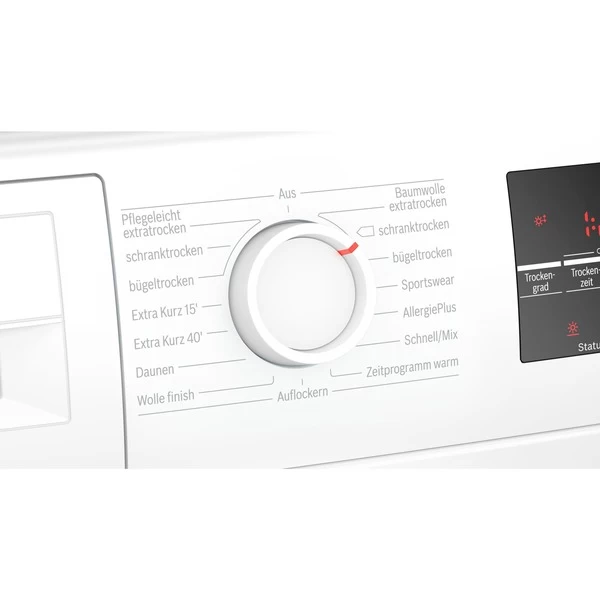 | Bedienung | Knitterschutz 120 min am Programmende, Drehwähler, TouchControl-Tasten: Schontrocknen, Signal, Knitterschutz, Fertig in, Programmdauer, Start/Pause, Trocknungsgradfeinjustage, 24 h Fertig in | ||